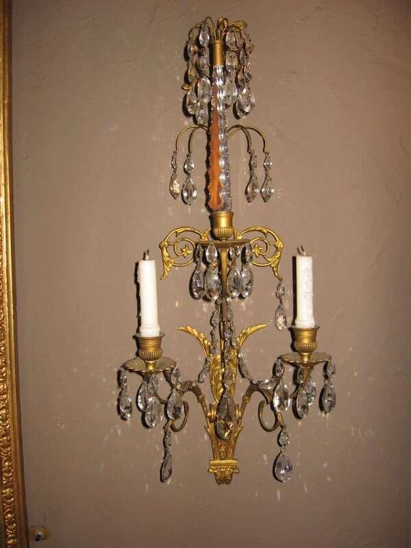 Pair of Neoclassical gilt bronze prism hung three light wall lights 19th century