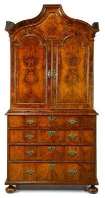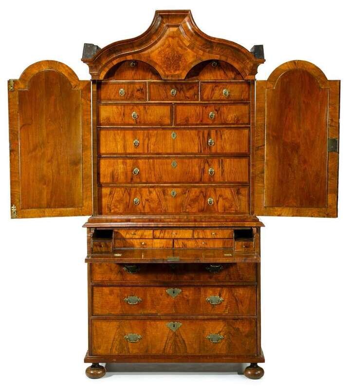 In two parts: the arched molded cornice surmounting twin conforming doors opening to ten graduated cross-banded drawers; over a fall front writing surface opening to and arrangement of drawers and pigeon holes, over three long drawers, raised on bun feet.