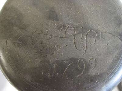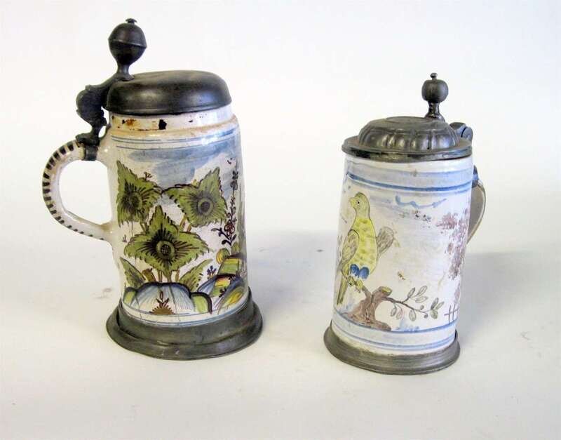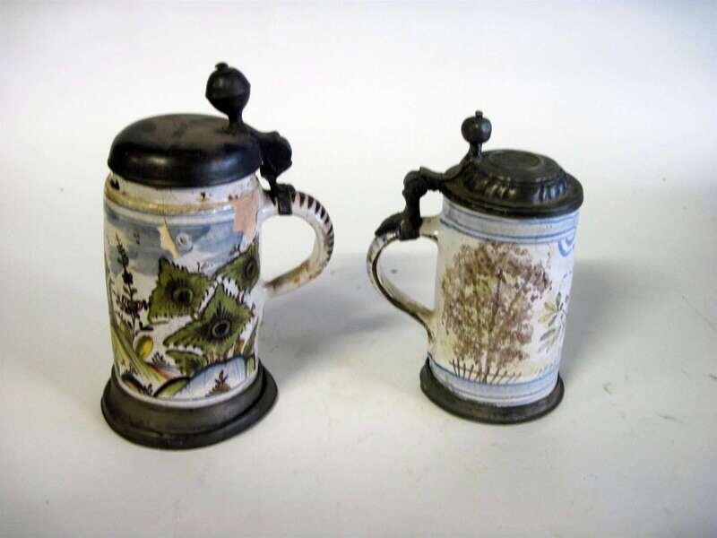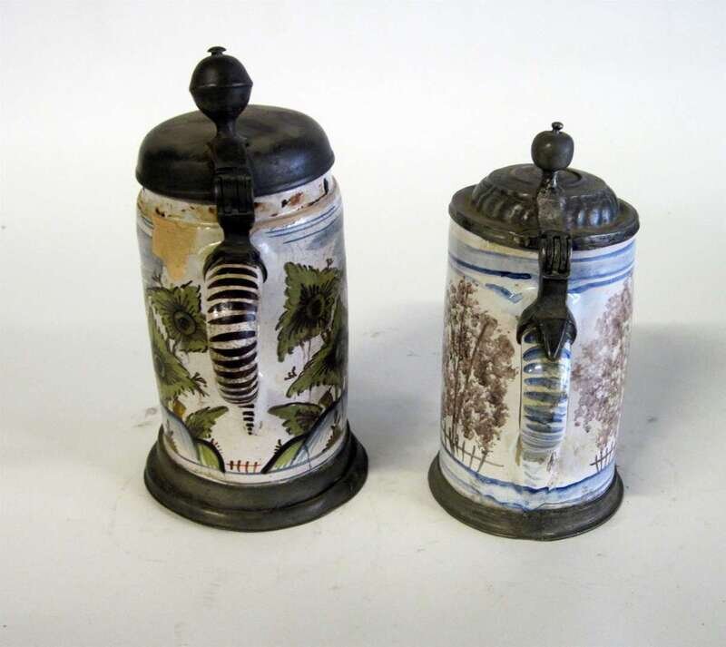 Two Delft polychrome glazed and pewter mounted tankards mid 18th century