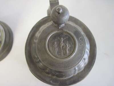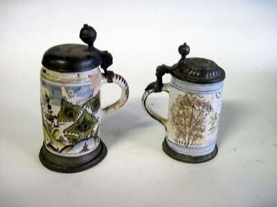 Each of cylindrical form, one painted with a gentleman in a landscape; the other with a bird on a branch, with hinged domed pewter lids and ball thumbpieces.(2).