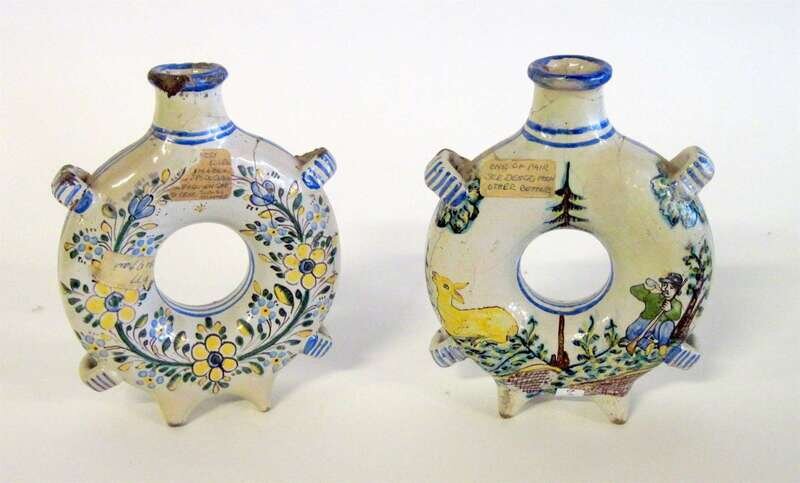 Each of O-form with applied loop handles, painted with hunt scenes and floral wreaths verso, raised on peg legs, maker's mark 'TS'.(2).