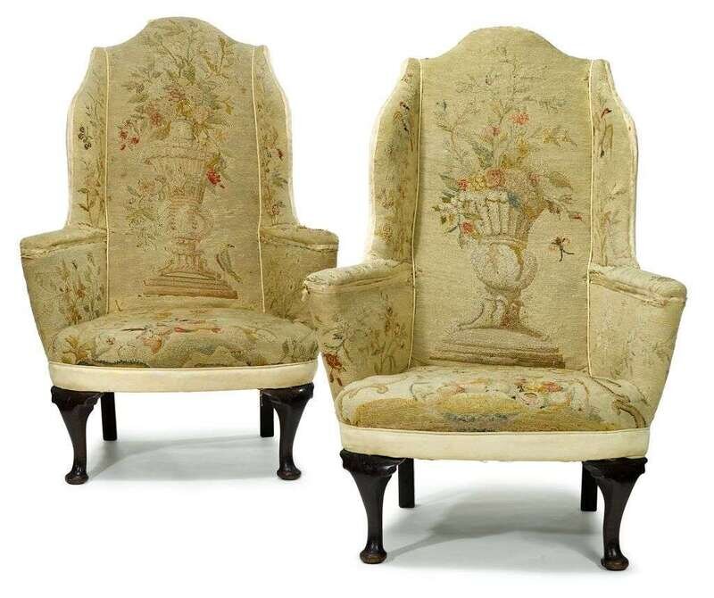 Pair of good George I walnut and needlework upholstered wing armchairs circa 1715