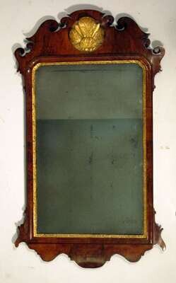 The tall beveled rectangular mirror plate surmounted by a gilt scalloped crest, with a serpentine apron.