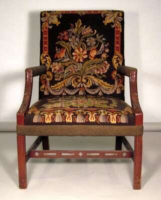 The shaped needlework covered back issuing padded arms, raised on straight legs joined by stretchers.