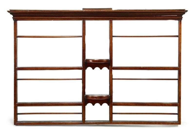 The molded straight cornice over two central D-shaped central shelves flanked by three long plate rails.