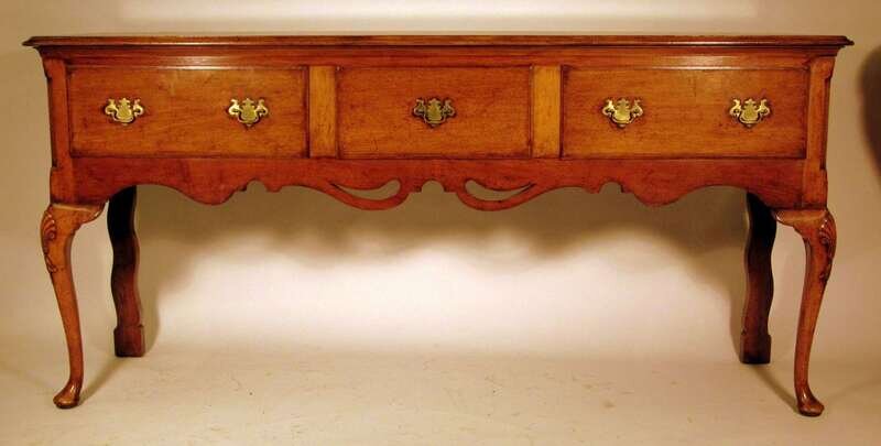 The rectangular molded edge top over three short drawers above a scroll cut apron and flanked by canted and fluted corners, raised on shell-carved cabriole forelegs and wavy rear legs.