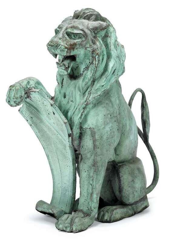 Heavy verdigris patina, depicted seated with a raised paw on a shield.
