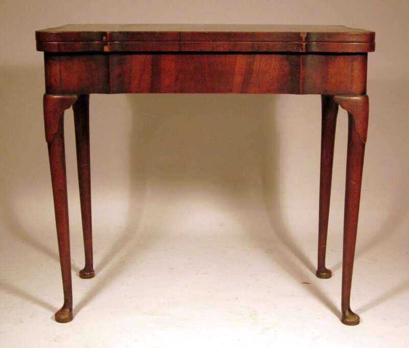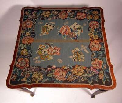 The shaped rectangular folding tip opening to reveal a needlework 'gaming' subject playing surface, over a shaped frieze, raised on foliate carved cabriole legs terminating on pad feet.