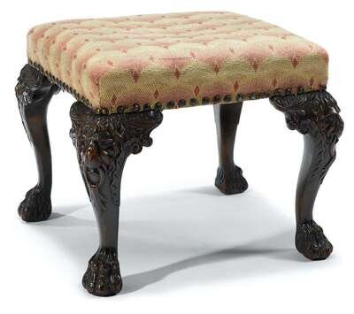 The needlework upholstered padded square cushioned seat raised on cabriole legs carved at the knees with lions masks and ending in hairy paw feet.