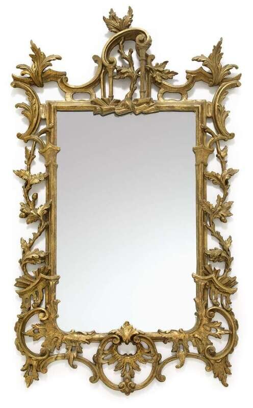 The rectangular mirror plate in an openwork carved giltwood frame with oak leaves and acorns, foliate and C scrolls.