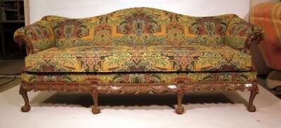 The serpentine shaped back over loose cushions, above swag and garland carved seat rail, raised on paw and claw forefeet and pad rear feet.