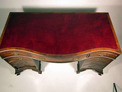 The serpentine leather insert top above three short frieze drawers, supported on twin convex banks of three drawers, raised on bracket feet.