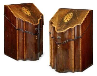 The sloped tops with a serpentine edge and oval shell inlay, over a conforming case, the interiors fitted for cutlery.(2).