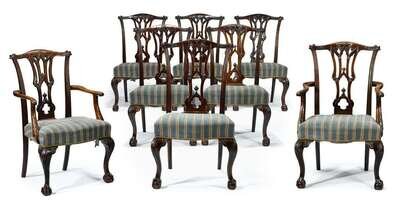 Comprising two arm and six side chairs: the shaped foliate carved crestrails, over a pierced interlaced splat, over an overupholstered serpentine seats, and raised on carved cabriole forelegs and splayed rear legs.(8).