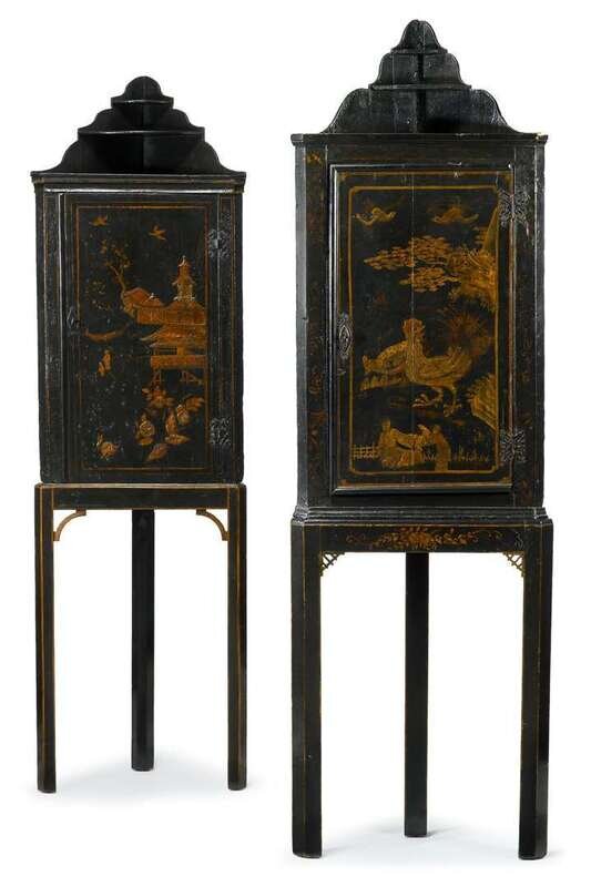 In two parts: the shaped cornice fitted with shelves over a single japanned cupboard door; the base with straight chamfered legs and corner brackets.(2).