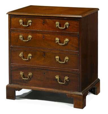 The molded rectangular top over four drawers graduated cockbeaded drawers, raised on bracket feet.
