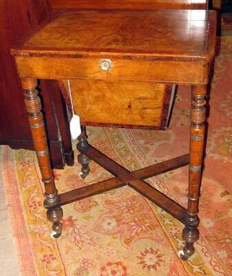 The banded rectangular top over single drawer with triangular base, raised on turned legs terminating on porcelain castors.