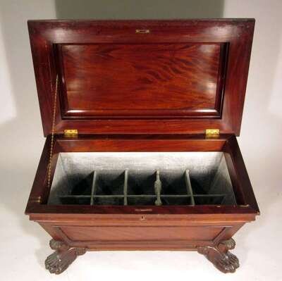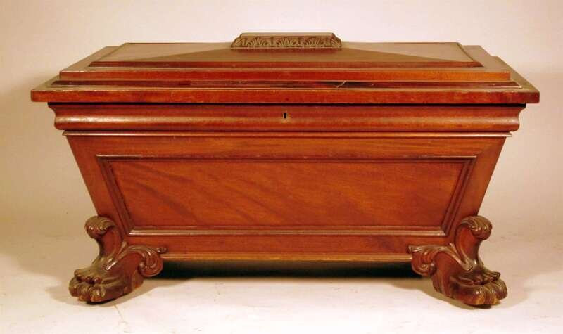 The paneled rectangular hinged top over a conforming base, raised on heavily carved paw feet, with a lead lined interior.