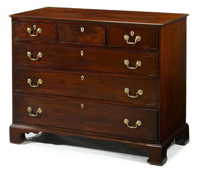 The molded rectangular top over three short and three long graduated cockbeaded drawers, raised on shaped bracket feet.