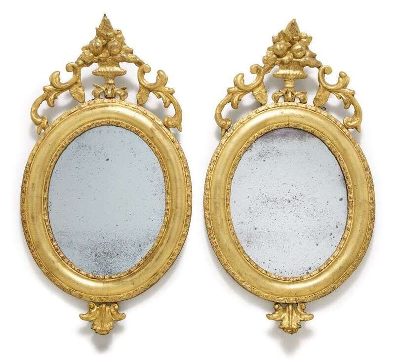Each surmounted by a fruiting urn and C-scroll pierced crest over an oval mirror plate in a wide molded frame with an acanthus drop finial. (2).