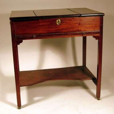 The three part rectangular top with a central hinged mirror flanked by hinged covers revealing a compartmented interior, above a brushing slide, raised on straight legs joined by a shaped undertier.