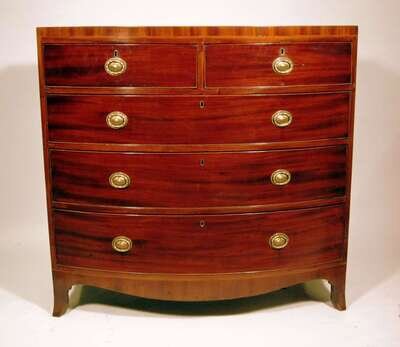 The crossbanded bow front top over two short and three long graduated drawers, raised on splayed feet.