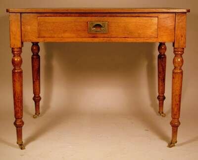 The molded square top over a single frieze drawer, raised on turned legs ending on brass castors.
