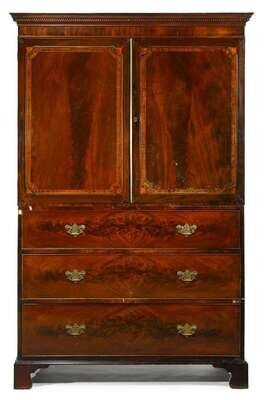 In two parts: the upper section with a dentil molded straight cornice over a pair of molded and banded panel doors; the lower section with three long graduated drawers, on shaped bracket feet.