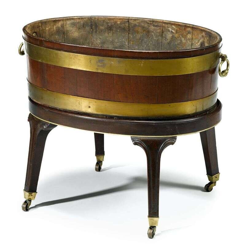 In two parts: the staved oval mahogany tub with two wide brass bands and ring handles, on a separate stand with carved, straight and angled legs terminating with brass caps and castors.