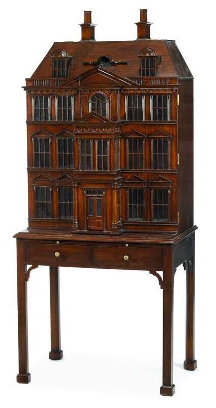 In two parts: the 'house' with a hinged door and removable chimney; on a stand with two frieze drawers and slided, raised on square legs ending on block feet.