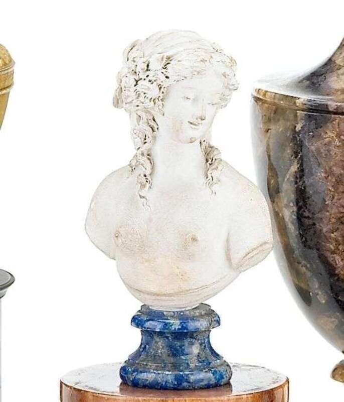 Terracotta bust of a young woman, signed 'Marin/ f(ecit) / 1782' on a lapis lazuli socle.