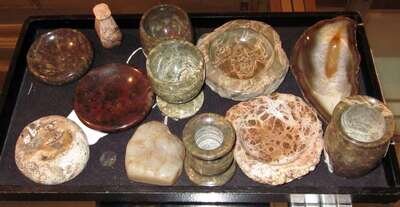 Comrpising four small serpentine vessels, three dishes, and a seal handle; a bloodstone dish, and three polished stone specimens.(12).