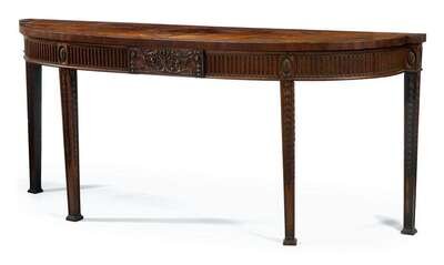 The D-shaped inlaid top over a fluted frieze raised centered by a foliate carved panel, raised on four square tapered and bell flower carved legs headed by paterae and terminating on block feet.