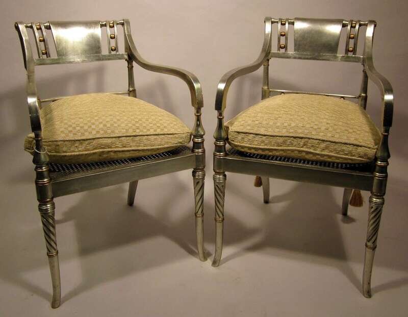 The curved backs with alternating gilded sphere splat over shaped arms, the silvered caned seats with a loose cushion, raised on fluted and shaped legs.(2).