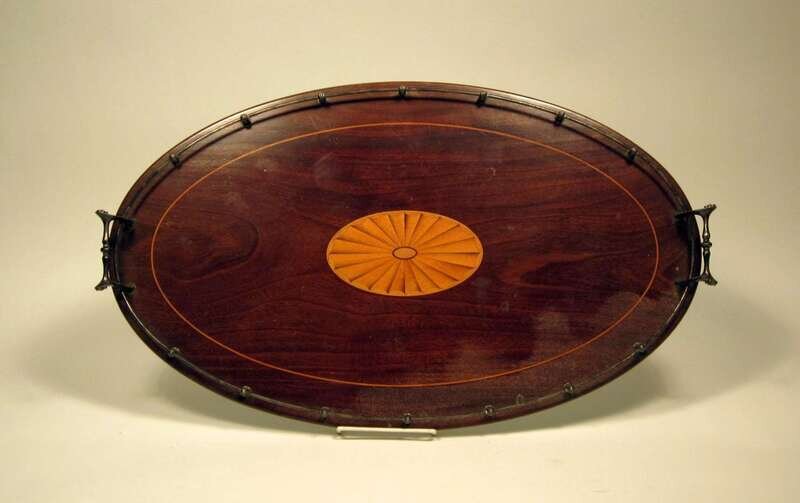 The oval mahogany tray centered by an inlaid fan medallion and stringing, mounted with a sterling silver gallery rail and scrolled handles.