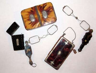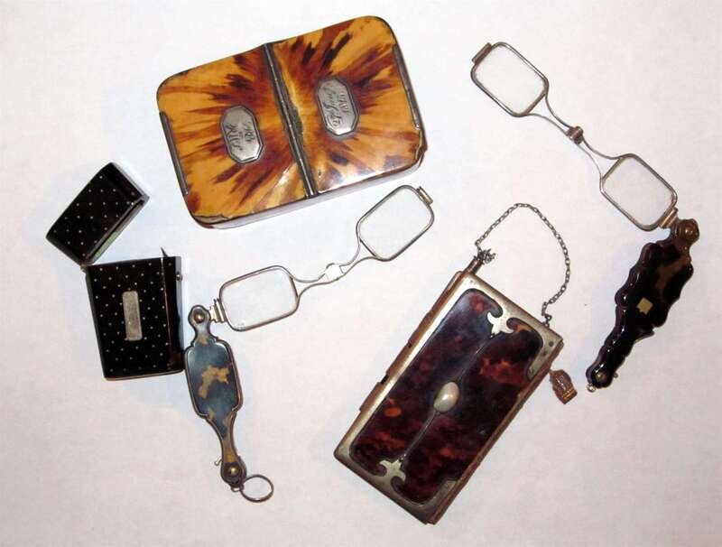 Comprising an Austrian silver mounted notebook with pearl thumbpiece; a hinged rectangular pill box, with inscription plaques dated 1815; a vesta case and two folding spectacles in tortoiseshell cases. (5).