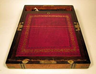 Typical form, opening to reveal a leather insert writing surface and pigeon holes.