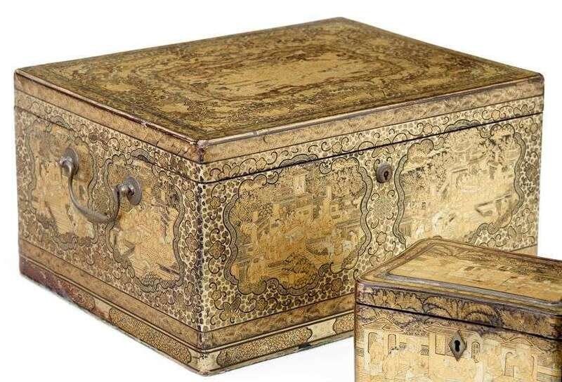 Rectangular with gilt lacquer depicting figural landscapes and foliate scrolls, with brass handles.