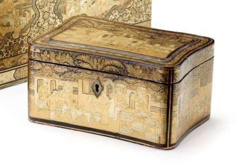The shaped rectangular top with typical Canton scenes, the interior with pewter tea wells.