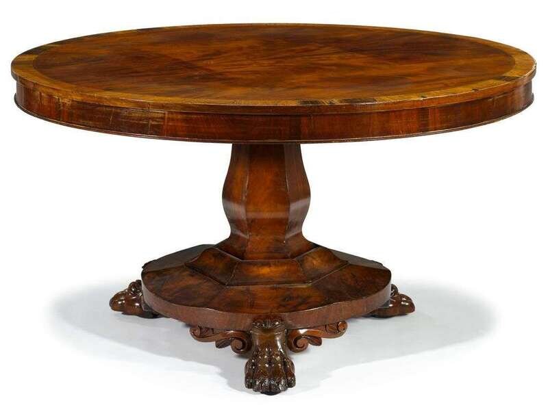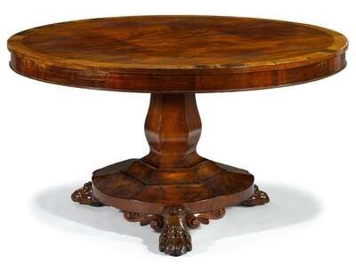 The circular crossbanded top over a plain frieze, supported by an hexagonal baluster column on a shaped circular base raised on three carved paw feet.