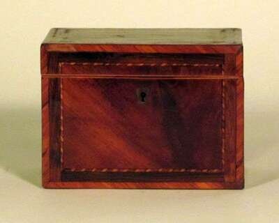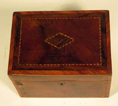 Rectangular top with a diamond cartouche and crossbanded edge, over with a metal lining.