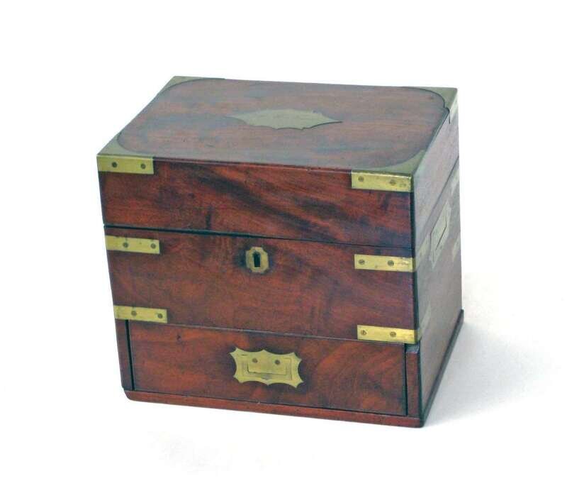 Of cubic form, the hinged lid centered by a brass plaque inscribed 'Mr. H. Fraser', the interior with brass label 'Wm. Brydon & Co./ 78 Cornhill/ London', with a compartmented base drawer with recessed brass handle.
