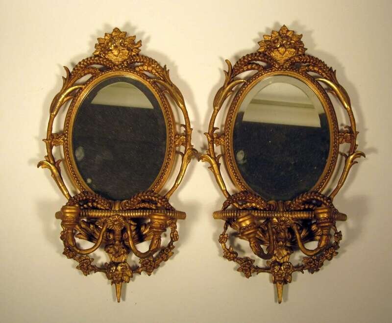 Each with an oval beveled mirror plate surmounted by foliate cresting above twin arms flanked by ribbon swags. (2).