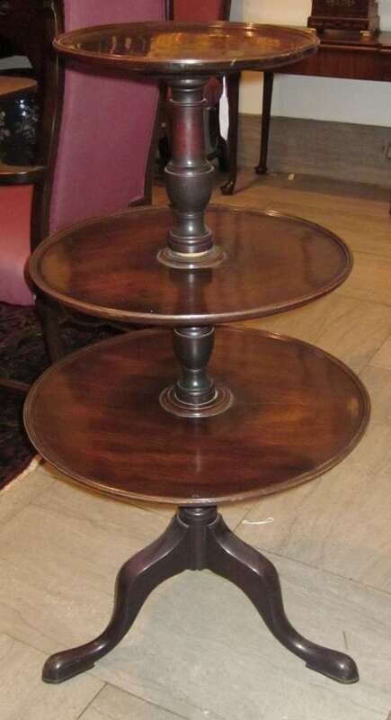 With three graduated dished circular tiers on a baluster form standard, raised on a triform base ending in pad feet.