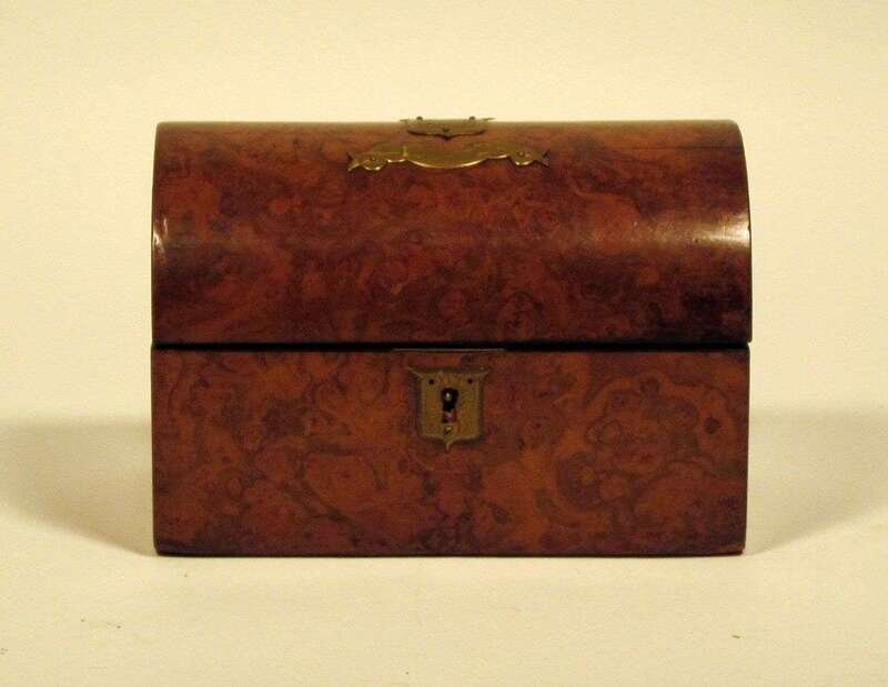 Casket form with a domed lid, the interior with a two lidded tea wells.