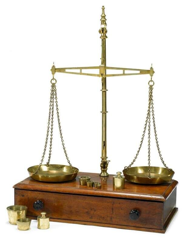 With two hanging scale pans, mounted on a mahogany base with a single long drawer housing an assortment of brass nesting weights.
