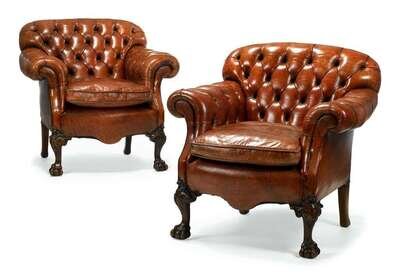 The brown leather button tufted back issuing scrolling arms flanking a loose cushion seat, raised on acanthus carved cabriole forelegs terminating on claw and ball feet.(2).