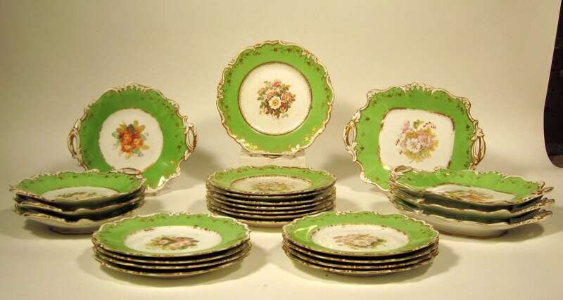 Comprising two oval footed dishes, two rectangular footed dishes, four circular footed dishes all with loop handles; and sixteen dessert plates; all centrally painted with floral bouquets within a gilt enhanced apple green scrolled border, unmarked.(24).
