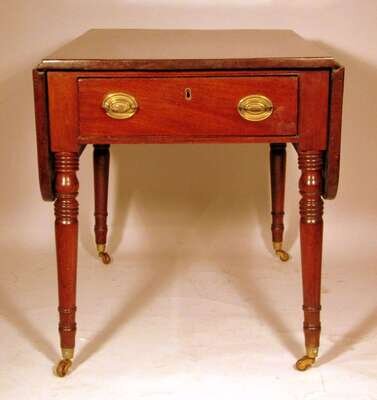 D-shaped drop ends over a single end drawer, raised on turned legs terminating on brass castors.