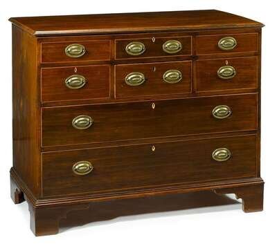 The molded rectangular top opening to reveal a fitted interior with washbasin cut out and an arrangement of covered compartments above five real and one false short drawers, over two long drawers, raised on bracket feet.